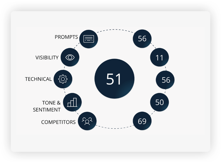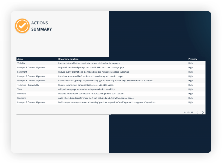 A clear, C-suite-ready view of your AI visibility and priority actions on how to improve your performance, including: