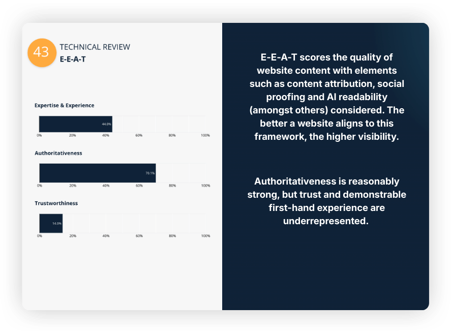 A structured deep-dive of how your organisation appears across AI-driven platforms including conversational search, AI overviews and emerging discovery platforms, along with technical and content-led insights on how you can improve your visibility.