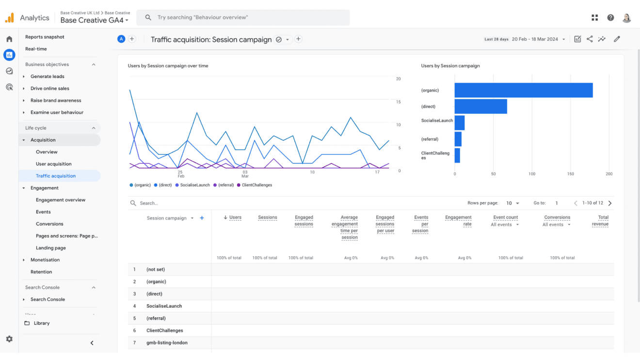 To find this information in GA4, go to your Reports, then under Acquisition, choose to view Traffic Acquisition. You can select from “Session source”, “Session medium” or “Session campaign” to analyse the performance. I recommend creating a dedicated Exploration Report in GA4 where you can view all campaigns at a glance.